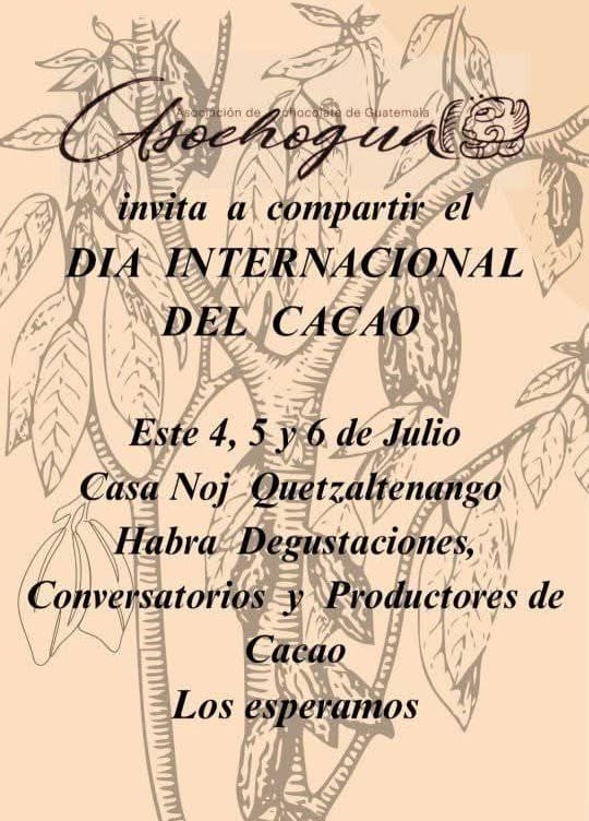 En conmemoración del Día Internacional del Cacao, la Asociación de Chocolateros de Guatemala (ASOCHOGUA) invita cordialmente a la Feria del Cacao, que se celebrará los días 4, 5 y 6 de julio en la emblemática Casa No’j de Quetzaltenango.