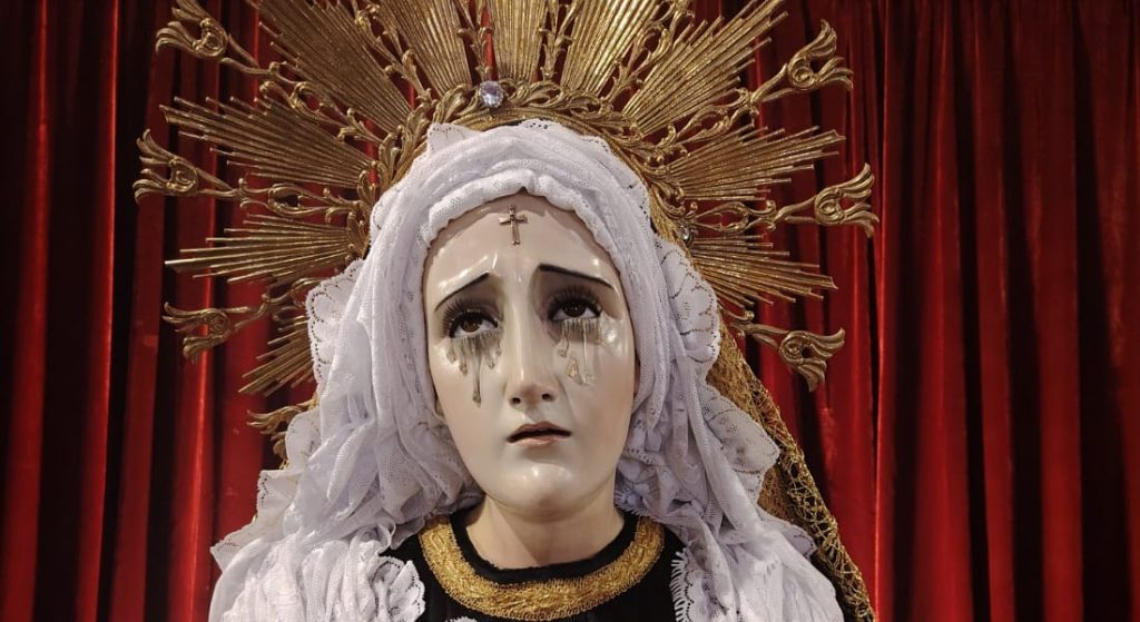 Un hecho de profundo simbolismo marcó aquella jornada: la Madre Dolorosa, que tradicionalmente viste de luto, fue revestida en esa ocasión con atuendo albo o blanco, color que expresa la pureza y consagración. Esta singularidad, rara vez vista en la iconografía de las Vírgenes Dolorosas, confirió al acto un carácter aún más solemne y memorable.