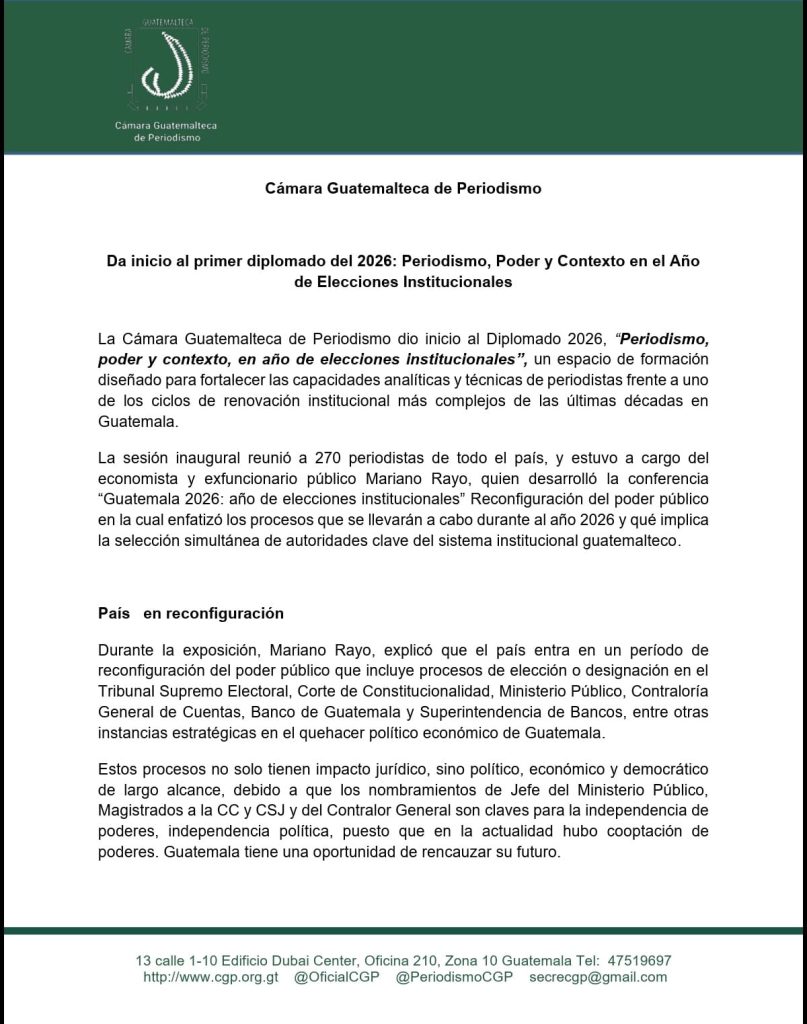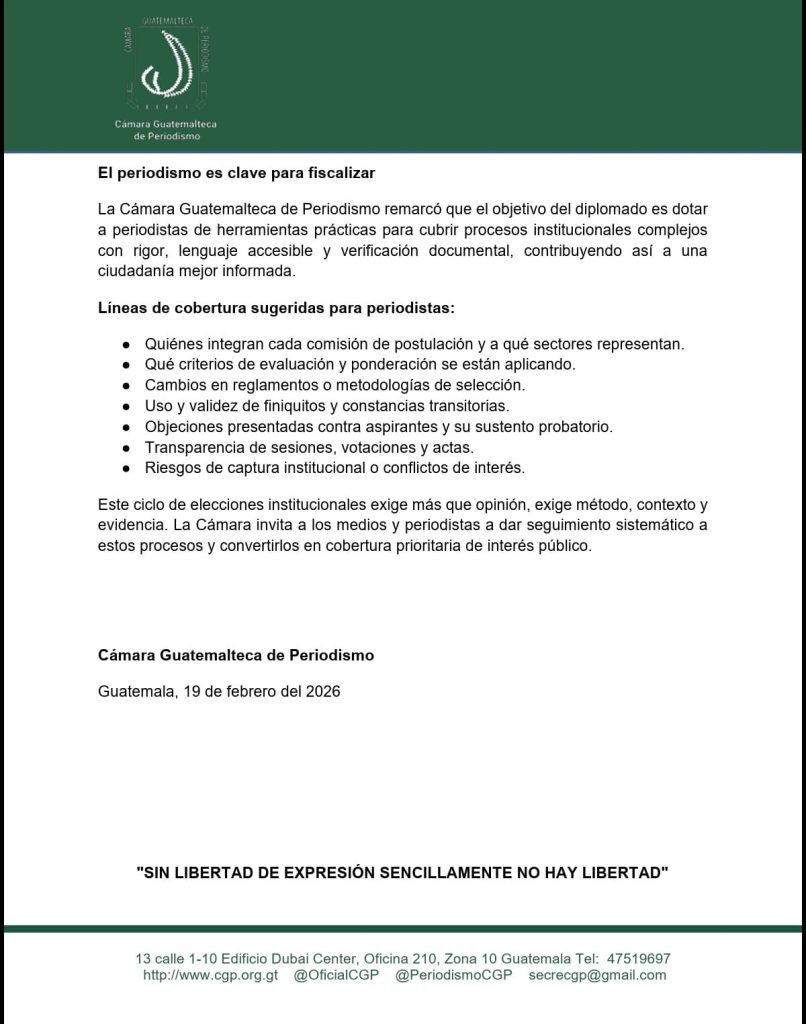 La Cámara Guatemalteca de Periodismo (CGP) emitió un comunicado oficial en el que resalta la importancia del periodismo en la fiscalización de los procesos de elección de autoridades durante el año 2026, período clave para la renovación institucional en Guatemala.